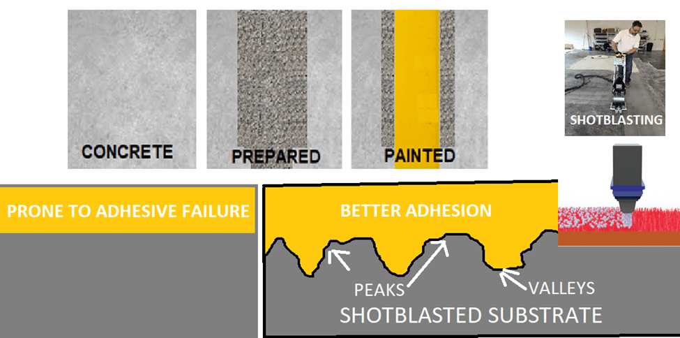 For the durable epoxy option, surface preparation is required for heavy traffic areas to ensure a strong adhesion between the paint and the floor. Our company uses shot blasting to roughen the surface for better bonding strength. The same services are provided for painting, but a high solids, heavy-duty, two-component, catalyzed, polyamide epoxy coating is used for demanding industrial requirements. It is important to note that our machines require clearance of at least 4 feet wide and that the client must clear the space for lines from any objects. If the job needs to be done in separate stages, additional service calls are subject to a mobilization charge.
